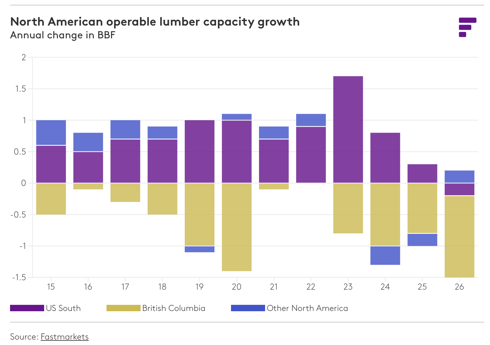 지난 몇 년 동안 제재목 시장에서는 생산 설비 폐쇄가 지속적인 추세였습니다. 2024년 평균 가동 가능 생산 능력과 2025년 예비 추정치에서도 비슷한 감소세(0.7 billion board feet (BBF))가 나타났습니다. 2017년 이후 생산 능력 감소는 주로 어려움을 겪고 있는 British Columbia 시장에 집중되었지만, 최근에는 시장 상황 악화와 경쟁 수종 대비 SYP 가격의 역사적인 할인율로 인해 미국 남부 지역에서 southern yellow pine (SYP) 제재소 폐쇄가 두드러지게 증가했습니다. 물론 산업 합리화는 여러 요인을 반영하는데, 여기에는 2021년 이후 수요 감소, 많은 주요 품목의 가격이 팬데믹 이전 수준으로 되돌아가면서 마진이 축소된 점, 그리고 BC의 장기적인 구조적 목재 문제, 캐나다산 목재 공급에 대한 관세의 꾸준한 인상, 그리고 이제 그 위에 추가로 부과된 10% 관세로 인한 캐나다의 심각한 어려움이 포함됩니다. 저희 전망에 따르면 자산 폐쇄 발표가 계속되고 캐나다 제재소들이 총 45%에 달하는 관세와 세금으로 인해 심각한 재정적 어려움에 직면하면서 이러한 상황이 지속될 것으로 예상됩니다. Fastmarkets는 SYP와 SPF 공급 모두에서 상당한 감소가 예상됨에 따라 2026년 북미 평균 연간 생산 능력이 1.3 BBF 감소할 것으로 전망하고 있습니다. 평균 연간 가동 가능 생산 능력이 1.0 BBF 혹은 그 이상으로 감소했던 마지막 시기는 글로벌 금융 위기 최저점이었던 2010년이었습니다. 생산 능력 합리화는 공급 과잉 상태인 침엽수 제재목 시장의 균형을 재조정하는 데 있어 핵심적인 동인이 될 것입니다.