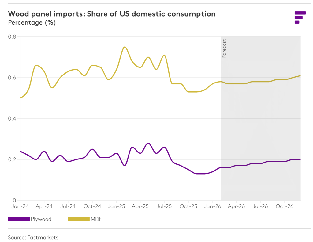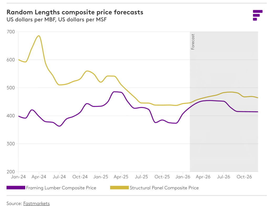 생산 능력 합리화와 대부분의 구조용 제품에 대한 수요의 완만한 회복이 결합되면서 2026년에는 대부분의 목재 제품 평균 가격이 상승할 것으로 예상됩니다. 특히 침엽수 제재목은 대폭 인상된 관세와 그에 따른 공급 조정으로 인해 가장 큰 가격 변동성을 보일 가능성이 높습니다. 구조용 패널 시장도 비슷한 역학 관계에 직면할 것으로 예상되지만, 그 정도는 다소 약할 것입니다. OSB는 침엽수 제재목보다 신규 건설에 대한 의존도가 더 높기 때문에 약세가 더욱 두드러질 것으로 예상되지만, 50% 관세 부과로 브라질산 공급량이 감소하면서 합판 시장의 공급 부족 현상이 나타나 이러한 전반적인 패널 시장의 과잉 공급 문제를 일부 상쇄할 것입니다. 파티클보드와 MDF 가격은 당분간 안정세를 유지할 것으로 예상됩니다. 이는 신규 건설 활동이 소폭 회복되더라도 이러한 제품에 대한 수요 증가로 이어지기까지는 시간이 더 걸릴 것이기 때문입니다. 이 제품들은 건축 과정에서 비교적 후반 단계에 사용되기 때문입니다. 비록 비교적 낮은 산업 가동률 덕분에 가격 변동성은 어느 정도 억제될 것으로 예상되지만, 특히 캐나다와 미국의 무역 관계를 둘러싼 정책 환경이 여전히 불확실하기 때문에 제품 시장에서는 예상치 못한 변동이 발생할 수 있습니다. 구매자와 판매자는 필요에 따라 이러한 위험 요소를 각 제품 가격에 반영할 것입니다.