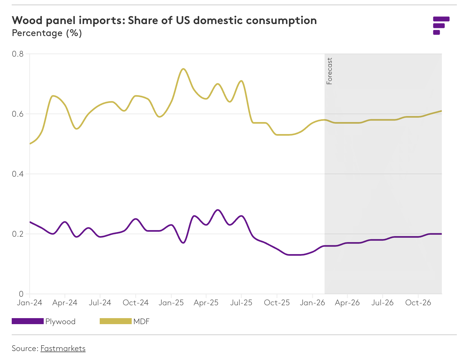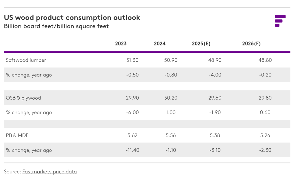 북미 목재 제품 수요의 약 70%-80%를 차지하는 주거용 건설 부문은 이러한 거시 경제 상황 속에서 눈에 띄지는 않더라도 완만한 개선세를 보일 것으로 예상됩니다. 주택 구매력의 소폭 개선만으로도 지난해 신축 건수가 8%-10% 감소했던 중요한 단독주택 시장을 안정시키는 데 도움이 될 것입니다. 현재의 속도보다는 다소 둔화되겠지만, 금리 인하 추세가 이어지고 전국 여러 지역에서 용적률 완화 정책이 시행되면서 더 많은 다세대 주택 건설 프로젝트가 경제성을 확보할 수 있을 것으로 예상됩니다. 마지막으로 Fastmarkets 수리와 리모델링 지수(Repair & Remodeling Index)에 따르면 주택 개량 활동은 재가속화 조짐을 보이고 있으며, 실질 가처분 소득이 안정적으로 유지되고 단기 금리 인하로 주택 담보 대출(HELOC)이 증가하면서 주택 개량 프로젝트가 더욱 활발해질 것으로 예상됩니다. 또한 이 분야에는 잠재된 프로젝트 수요가 상당하며, 올해 하반기에 인플레이션과 고용 시장에 대한 불확실성이 해소되면 이러한 수요가 본격적으로 나타날 것으로 보입니다. 제품별로 수요는 차이가 있겠지만, 2026년 미국 목재 제품 소비량은 전년과 비슷한 수준을 유지할 것으로 예상됩니다. 구조용 패널 시장은 가장 견고한 실적을 보일 것으로 예상되는 반면, 비구조용 패널 시장은 주택 완공과 국내 가구와 캐비닛 생산 감소의 영향을 계속 받으면서 상대적으로 부진할 것으로 전망됩니다. 전망에 대한 하방 위험이 존재하지만, Fastmarkets는 작년의 상당한 손실이 2026년에는 일단락될 것으로 보고 있으며, 하반기에는 목재 제품 시장이 재성장 국면에 진입하여 2027년에는 견고한 성장을 이룰 것으로 예상합니다. 그러나 당분간은 단기적인 역풍이 지속되면서 수요 측면에서 어려움이 계속될 것으로 보입니다.