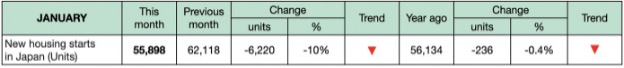 일본 국토 교통성(Japan Ministry of Land, Infrastructure, Transportation and Tourism)이 발표한 자료에 따르면, 2026년 1월 일본의 목조 주택 신축 건수는 32,986건으로 전년 동기 대비 12.0% 증가했으며, 전체 주택 신축 건수는 55,898건으로 0.4% 소폭 감소했습니다. 이달 전체 주택 신축 건수 중 목조 주택이 약 59.0%를 차지했습니다. 2025년 12월과 비교했을 때 목조 주택 신축 건수는 12.1% 감소했고, 전체 주택 신축 건수는 10.0% 감소했습니다. 연간 기준으로 볼 때, 2026년 1월 주택 신축 건수는 737,553호로, 2025년의 740,667호보다 0.4% 감소했으며, 지난 10년간의 평균인 866,320호보다는 14.9% 감소했습니다.