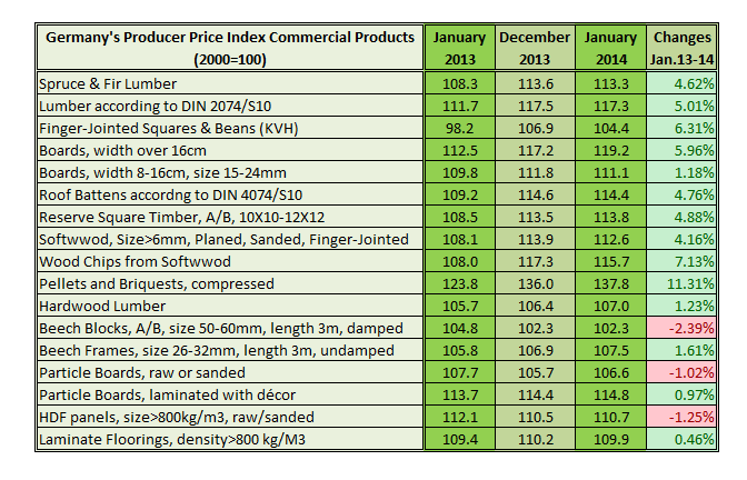 Pine sawnwood 2014년 1월 수출액은 전년 ($10.3 million) 대비 하여 35% 상승하여 $13.9 million 이었고, 수출량은 28% 상승하여 61,000 M3 이었습니다. 하지만 tropical sawnwood 2014년 1월 수출량은 22,800 M3 로 전년 대비 8.8% 하락하였고, 수출액은 4.2% 하락하였습니다. Pine plywood 수출액은 12% 하락하여 $27.2 million 이었습니다. Tropical plywood 2014년 1월 수출량은 5,400 M3로 59% 하락하였습니다. 긍정적인 상황은 목재 가구 수출이 2014년 1월에 $30 million로 전년 대비 6.4% 상승하였습니다.