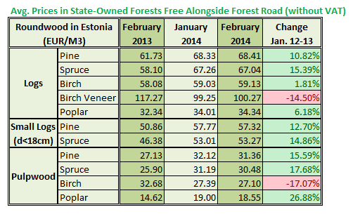 큰 변화없는 Estonia의 2월 원목 가격 07 Monday Apr 2014 Posted by KIM, HANSEOK in News ≈ Leave a comment Estonia의 roundwood 의 2월 가격은 1월 과는 대부분이 큰 변화가 없이 보합세를 유지하고 있습니다. Birch veneer와 pulpwood에서 가장 큰 가격 변화가 있었는데, birch veneer는 EUR 1/M3이상 상승하였지만, pulpwood의 가격은 30에서 거의 80 cents/M3 하락하였습니다. Roundwood Price in Estonia in Feb 2014 Share this: Click to email a link to a friend (Opens in new window) Email Click to print (Opens in new window) Print Click to share on X (Opens in new window) X Click to share on Facebook (Opens in new window) Facebook Click to share on LinkedIn (Opens in new window) LinkedIn More Click to share on Pinterest (Opens in new window) Pinterest Click to share on Tumblr (Opens in new window) Tumblr Click to share on Reddit (Opens in new window) Reddit Click to share on Pocket (Opens in new window) Pocket Like Loading... Related