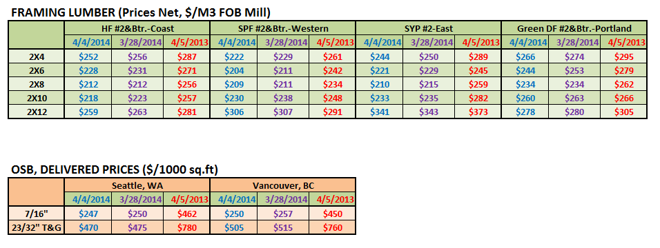 4월이 시작되었지만 시장의 약세를 이겨내지는 못하고 있습니다. 중서부 북부 지역과 동북부 지역의 나쁜 기후 조건이 시장 약세의 원인을 여전히 제공하고 있고, 계속된 시장 약세의 변명거리가 되기로도 지겨울 정도입니다. 시장은 전체적으로는 과잉 공급인 상황이고 Traders는 공장의 재고 상황에 주목을 하고 있습니다. 생산업체들은 여전히 운송 문제에 골머리를 앓고 있습니다. 구조재의 대부분의 가격이 하락세를 보여 주면서 Random Lengths Framing Lumber Composite의 가격이 $8 하락 하여 $370을 기록 하였습니다.