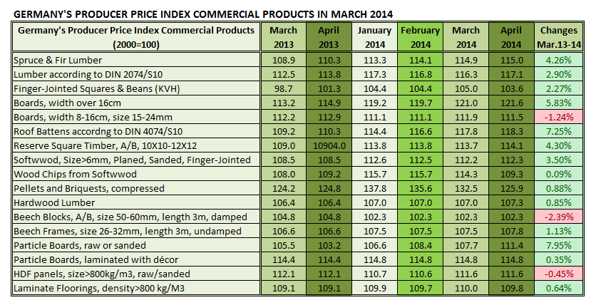 4월 독일에서 목제품 생산자 가격은 3월에 비하여 현격히 증가 하였습니다. 이런 경향은 Hardwood 와 timber 보다는 solidwood의 건축 자재에서 더욱 명백하였습니다. Solid wood 건축 자재의 경우 소폭 board의 가격만 작년 보다 하락하였고, 다른 제품들은 전년 대비 약 3-7% 상승하였습니다. Hardwood 와 wood composites의 평균 가격은 단지 1%정도의 상승이 있었지만 raw boards는 약 8% 상승하였습니다. Particleboard의 경우 지난 달의 가격 하락 양상과는 다르게 4월 가격이 전녀 대비 8% 상승하였고, 3월에 비하여는 3.4% 상승하였습니다.