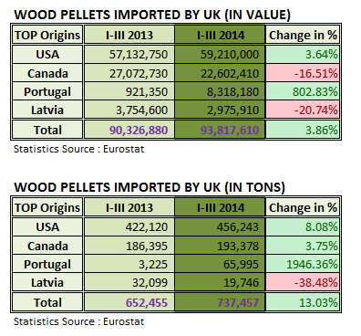 영국에서 작년보다 2배이상의 wood pellets을 사용하였지만, 2014년 1사분기 동안에 영국에서의 wood pellets의 수입은 속도가 떨어지고 있는 상황입니다. 2013년 1사분기와 비교해 보면 수입량은 13%, 수입액은 4% 상승하였습니다. 수입 국가별 점유율을 고려해 보면 미국이 전체 수입의 61%를 차지하고 있고, 캐나다에서는 22%, Portugal은 9%를 차지하고 있습니다.