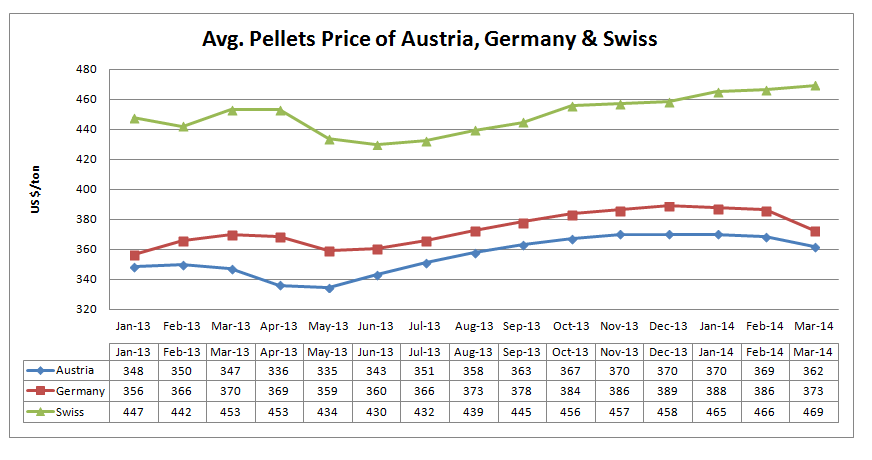 스위스 Wood Pellet의 가격 동향 14 Monday Jul 2014 Posted by KIM, HANSEOK in Uncategorized ≈ Leave a comment 2014년 7월 스위스 Wood Pellet의 가격은 전년 대비 약 1% 상승하였고, 정체되었던 6월 가격보다 약간 상승하였습니다. 월별 가격 변화는 아래의 그래프와 표를 참조하세요. 그리고 스위스 인근의 오스트리아와 독일과의 가격비교는 아래 그래프와 표를 참조하세요. 스위스내의 연료 오일, 천연 가스와 wood pellet의 비교는 다음과 같습니다. Share this: Click to email a link to a friend (Opens in new window) Email Click to print (Opens in new window) Print Click to share on X (Opens in new window) X Click to share on Facebook (Opens in new window) Facebook Click to share on LinkedIn (Opens in new window) LinkedIn More Click to share on Pinterest (Opens in new window) Pinterest Click to share on Tumblr (Opens in new window) Tumblr Click to share on Reddit (Opens in new window) Reddit Click to share on Pocket (Opens in new window) Pocket Like Loading... Related