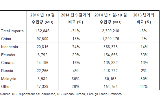 2014년 10월 미국에서 활엽수 합판의 수입이 극격하게 감소 21 Wednesday Jan 2015 Posted by KIM, HANSEOK in News ≈ Leave a comment Tags미국, 수입, 합판, 활엽수, US 2014년 10월 미국에서의 활엽수 합판의 수입이 거의 1/3 감소하였습니다. 10월 수입량은 182,846 M3 이었습니다. 대부분의 공급 구가에서의 수입이 감소하였는데, 가장 극심한 수입 감소 국가는 인도네시아이었습니다. 중국에서 활엽수 합판 수입량이 전달과 비교하여 18% 감소하여 97,500 M3이었고, 캐나다와 Ecuador에서의 수입은 각각 16%, 29% 하락하였습니다. Share this: Click to email a link to a friend (Opens in new window) Email Click to print (Opens in new window) Print Click to share on X (Opens in new window) X Click to share on Facebook (Opens in new window) Facebook Click to share on LinkedIn (Opens in new window) LinkedIn More Click to share on Pinterest (Opens in new window) Pinterest Click to share on Tumblr (Opens in new window) Tumblr Click to share on Reddit (Opens in new window) Reddit Click to share on Pocket (Opens in new window) Pocket Like Loading... Related