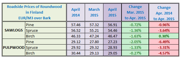 2015년 4월 핀란드 원목 가격은 대부분 하락하였습니다. 지난 몇 달간의 상승세 이후에 4월 birch 제재목용 원목 가격은 Euro 0.77/m3 하락하였습니다. 하지만 2014년 4월보다는 높은 가격 이었습니다. 반대로 birch pulpwood 는 2014년 4월보다 4% 이상 하락하였습니다. Spruce 제재목용 4월 원목 가격은 3월보다 Euro 0.75/m3 , 전년 대비 Euro 2/m3 하락하였습니다.