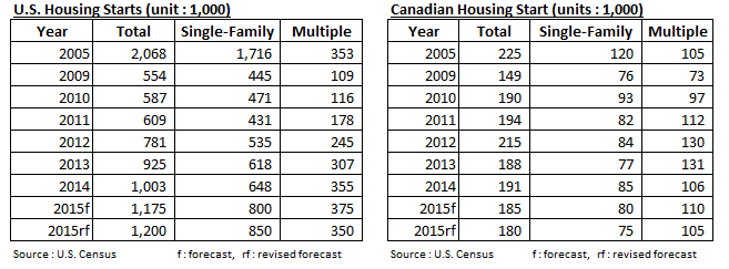 지난 12월에 미국에서의 주택 신축은 상승 경향을 예상하였습니다. 그러나 1사분기 동안의 결과는 혼합된 양상을 보여 주었고, 기상 악화로 부진을 보여주기도 하였습니다. 4월에 주택 신축은 20% 상승하였지만 5월에는 11% 이상으로 물러서면서 여전히 새주택 건설에 혼합된 신호가 나타나고 있습니다. 지난 몇 년간 성장을 방해하는 근본적인 문제들이 여전히 산재하면서, 전체적으로는 어느 누구도 새주택 시장이 강세라고 주장할 수 없습니다. 대출이 주택 시장의 필요에 따라가지 못하고 엄격한 신용 조건이 급격한 증가를 억제하고 있습니다. 그러면서 처음 주택을 구입하려는 구매자들과 저임금 가족 구매자들이 시장에 접근하기 힘든 상황이고, 주택가격은 상승하고 재고의 여유가 많지 않은 상황입니다. 2사분기에 대한 주택 신축 예상은 상향세가 강하지는 않겠지만 성장 경향이 좀 더 안정적일 것으로 예상하고 있습니다. 주택 대출 이자율의 하락과 주택 임대 가격이 상승하면서 주택 시장이 도움을 받게 될 것으로 예측됩니다. 결론적으로 2015년 주택 신축에 대한 초기 예상인 1,175,000 units는 1,200,000 units로 상향 조정 예상됩니다.