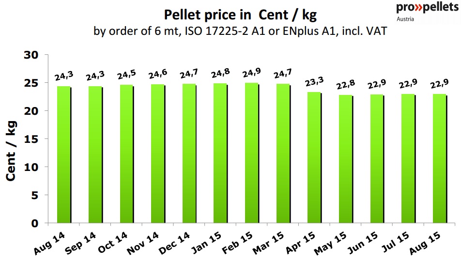 2015년 8월 오스트리아 wood pellet의 가격은 안정적이었습니다. 1 tons 8월 가격은 7월과 비교하여 0.1%로 경미하게 하락하였고 현재 가격은 6 tons 구매 기준으로 € 229.2/tons 이고 2014년 8월과 비교하여 5.7% 낮습니다. 포장된 wood pellet의 8월 평균 가격은 pallet 주문 기준으로 € 3.82/15 kg sack 으로 7월과 비교하여 0.1% 상승하였지만 2014년 8월에 비하여 3.8% 하락하였습니다. 현재 오스트리아 wood pellet 평균 가격의 연료 유류에 대한 가격 이점은 30.8% 이고, 천연 가스에 대한 가격 이점은 44.7% 입니다.
