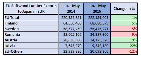 2014년 EU의 침엽수 제재목의 일본 수출은 37% 하락하여 EUR 526 million을 기록하는 재앙 같은 시간을 보냈는데, Eurostat의 자료에 따르면 2015년 1월에서 5월까지 일본 수출은 전년 대비 1% 상승하여 EUR 222,1 million 을 기록하였습니다. 판란드의 일본 수출은 5% 상승하였지만 스웨덴과 루마니아의 수출은 각각 5%, 9% 하락하였습니다. EU의 일본 전체 수출액에서 핀란드는 30%, 스웨덴은 25%, 루마니아는 16%를 차지하였습니다.