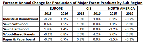 전체적으로 2015년 산림 생산품의 생산은 북미와 유럽의 경우 혼합된 경향을 보여주었고, CIS에서는 좀더 긍정적인 모습을 보여 주었습니다. 2016년 예상은 유럽의 경우는 좀 더 긍정적이고, 북미는 혼합된 경향이 유지될 전망이고, CIS 지역은 상승속도가 둔화될 것으로 예측하였습니다.