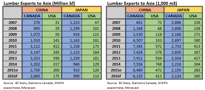 침엽수 제재목 동의안 (SLA) 가 10월에 만료되었지만 2016년 10월까지는 새로운 조약이 시작되지 않을 것으로 예상하고 있습니다. 만료된 동의안은 1년 동안의 정지 조항을 포함하고 있기 때문입니다. 내년 미국 대통령 선거와 캐나다 달러 약세의 배경들이 협상에 파란을 일으킬 것으로 예상하고 있습니다. 2015년 미국 서부 지역의 제재목 생산량은 2014년과 비교하여 약 1% 하락하였습니다. 미국 자국 시장은 꾸준하였지만 해외에서의 수요는 감소하였습니다. 부가적으로 산불때문에 원목 공급에 어려움을 겪었습니다. 미국 남부 지역의 2015년 제재목 생산량은 2014년보다 4% 넘게 상승하였지만 성장율은 2014년보다 낮았습니다. 남부 지역은 다른 생산 지역에서의 강한 경쟁력을 도전받았고, 또한 수요 부진으로 좋지 않은 시장 조건이었습니다. 캐나다의 경우 모든 지역에서의 생산량이 전년 대비 증가하였습니다. 가장 큰 증가는 BC 외곽지역으로 10% 이상 증가하였지만 BC 지역의 경우에는 중국 수요 부진과 Mountain beetle의 문제가 계속되면서 이 지역 생산업체들은 어려움을 겪었습니다. 2016년에는 미국의 제재목 생산량은 2015년과 비교하여 약간 증가할 것으로 예상하고 있습니다. 2016년 예상 생산량은 32 billion bf으로 20년전의 생산량과 비슷하 수준입니다. 미국내 시장 수요 증가보다는 수출 시장의 수요 하락이 더 클 것으로 생각 됩니다. 2016년 캐나다 제재목은 캐나다 달러 약화로 경쟁력을 더 갖게 되어서 생산력이 증가할 것으로 예상하고 있습니다. 캐나다 동부에서의 생산량이 가장 크게 증가할 것으로 예측되고, 서부 지역의 경우에는 수출 시장의 수요 감소와 원목의 공급 제한성을 어떻게 처리할 것인가가 관건 입니다.