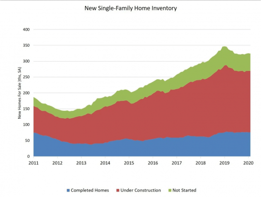 현재 월간 신축주택 공급은 1월에 5로 하락한 이후에 6.4로 증가하였습니다. 6이상의 수준은 단독주택 건축의 향후 하락 압력과 일치하는 것 입니다. 완공된 주택이나 바로 입주가 가능한 주택수는 전국적으로 76,000 입니다.
