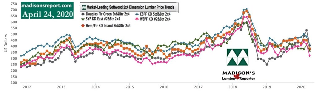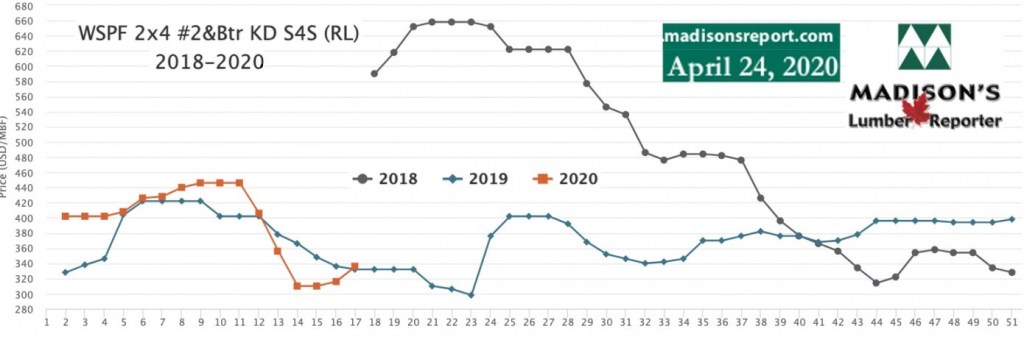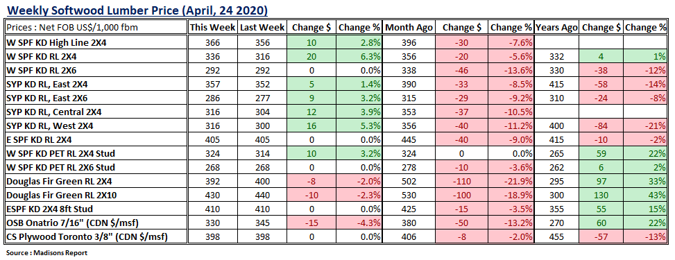 지난주의 작은 반등으로 북미 침엽수 제재목 가격은 2주전 최저점에 올라오고 있습니다. 단기간으로 유지될지, 아니면 제한된 공급으로 인해서 가격이 급등하게 될지 모두의 관심 상황입니다. 한달전 혹은 2달전의 대변동이 끝났다고 보기 힘들다고 Madison’s Lumber Report는 발표하였습니다. 몇몇 침엽수 제재목 기준 가격의 도매 가격은 지난 2주전부터의 손실을 만회하였고, 4월 초 가격 수준을 기록하였습니다. 침엽수 제재목의 기준가격인 Western Spruce-Pine-Fir KD 2×4 #2&Btr (RL)의 가격이 지난해 같은 시기 대비 거의 같은 수준으로 US$336 mfbm (FOB sawmill).이었습니다. 전세계의 바이러스 전염병의 영향으로 사업과 실제 생활에 발생한 갑작스러운 변화에 더하여, 캐나다 북서부 지역은 지금 심한 홍수를 겪고 있습니다. 봄이 끝나가면서 거대한 눈과 얼음이 녺아서 Alberta와 BC의 강에 유입되고 있습니다. 반면에 캐나다 서부 연안의 제재소들은 웅장한 Fraser강의 봄철 해빙, 홍수를 환영합니다. 대개는 홍수가 고속도로와 철길에 도달하여, 원목과 제재목 운반을 잠정적으로 중단합니다. 2020년 4월 24일로 마감한 한주동안 지난주 보다 가격이 상승하여, 기준 가격인 Western Spruce-Pine-Fir 2×4 가격은 US$336 mfbm으로 지난 주보다 $20, 6% 상승하였고, 1달전 가격보다는 $20, 6% 하락하였습니다. 그리고 1년전과 비교하면 $4, 1% 올랐습니다.
