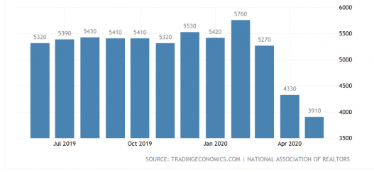 2020년 5월 미국에서 기존 주택 판매량은 4월과 비교하여 9.7% 하락하여 계정조정필년율 (seasonally adjusted annual rate : SAAR)로 3.91 million 이었습니다. 기존 주택 판매량은 미국 전역에서 하락하였고, 특히 북동부 지역에서는 급격하게 감소(-26%)하였습니다. 2020년 5월 모든 형태의 기존 주택의 중간값은 2019년 5월 (US$278,200) 가격보다 2.3% 증가하여 $284,600 이었습니다. 2020년 5월말 기존 주택의 전체 재고량은 1.55 million으로 4월보다는 6% 증가하였지만, 2019년 5월보다는 19% 하락하였습니다.