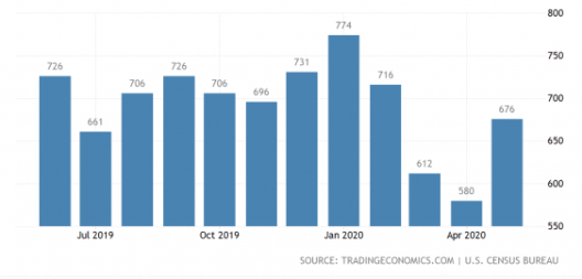 2020년 5월 미국의 신축 단독 주택 판매는 4월과 비교하여 17% 증가하여 계정조정필년율 (seasonally adjusted annual rate : SAAR)로 676,000 이었습니다. 4월 자료는 623,000에서 580,000로 급격하게 낮게 수정되었지만, 5월 수치는 지난 3달 동안 가장 높았습니다. 미국 북동부 지역 판매는 46% 증가하여 32,000, 서부 지역은 29% 상승하여 169,000, 남부 지역은 15% 높아져 402,000이었지만, 중서부는 6% 하락하여 73,000이었습니다. 2020년 5월 시장에는 신축 주택이 318,000 나왔는데, 지난 4월보다 2.2% 하락하였습니다. 5월 판매 속도는 5.6월로 시장에 공급된 주택이 소진되고 있습니다. 신축 주택의 중간값은 1년전에 비하여 US$312,700 에서 US$317,900로 높아졌습니다. 그리고 5월 미국의 신축 주택 판매는 전년 대비 12.7% 상승하였습니다.