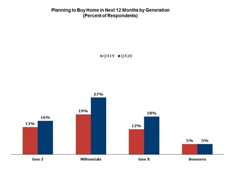 주택 구매를 의도하는 인구통계학적 집단중에 밀레니얼 세대가 눈에 띕니다. 2019년 4사분기부터 2020년 4사분기까지 주택 구매를 계획하는 밀레니얼 세대는 8 포인트 증가하여 27% 이었습니다. X 세대는 6포인트 증가하여 18%, Z 세대는 3포인트 상승하여 16%, 베이비 붐세대는 전년 대비 수준을 유지하면서 5% 이었습니다.