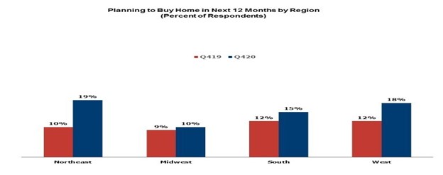 지리적으로 주택 구매를 계획하는 성인 비율은 4개의 지역 모두 상승하였는데, 북동부 지역은 9포인트 상승하여 19%, 서부 지역은 6포인트 증가하여 18% 이었습니다.