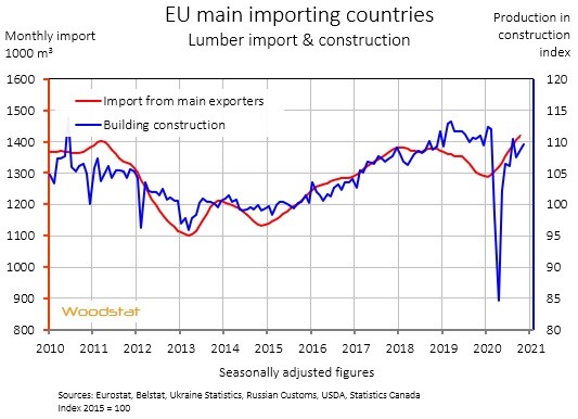 2020년 11월 EU의 완공된 건물 (주거용, 학교, 상업용 가게등) 건설 지수는 10월과 비교하여 0.7% 높았다고 Eurostat는 발표하였습니다. 지수는 여전히 높은 수준을 유지하고 있습니다. Woodstat의 CEO인 Jenny Wessung에 따르면 일부 유럽국가들에서의 ‘do it yourself) 분야가 매우 활발해 지면서 시공작업이 상승하였고, 이로 인하여 침엽수 제재목 수요가 증가하였습니다. 그리고 2021년에서 2023년까지 시공 작업은 계속적으로 상승할 것으로 예상합니다. 영국 주택 분야는 높게 활성화되고, 최근 데이타는 지난 해와 유사합니다.