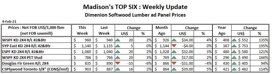 소비자들은 좀 더 새롭게 건축되고, 가격이 알맞은 주택을 원하지만, 구조용 제재목 가격이 급격하게 치솟으면서 건축업자들은 그런 주택을 인도하기가 점점 더 어렵다는 것을 알아가고 있습니다. Random Length에 따르면 목요일 오전에는 제재목 가격이 $1,000/mbf 보다 약간 아래이었지만, 결국에는 3달전 가격보다 2배 상승하여 기록적인 가격인 $1,004.90을 기록하였습니다. 높아진 제재목 비용 때문에 1월의 미국 주택 신축은 하락하였습니다. 극도의 필요로 하는 단독 주택의 1월 신축은 2020년 12월보다 12% 하락하였다고 U.S. Census는 발표하였습니다.