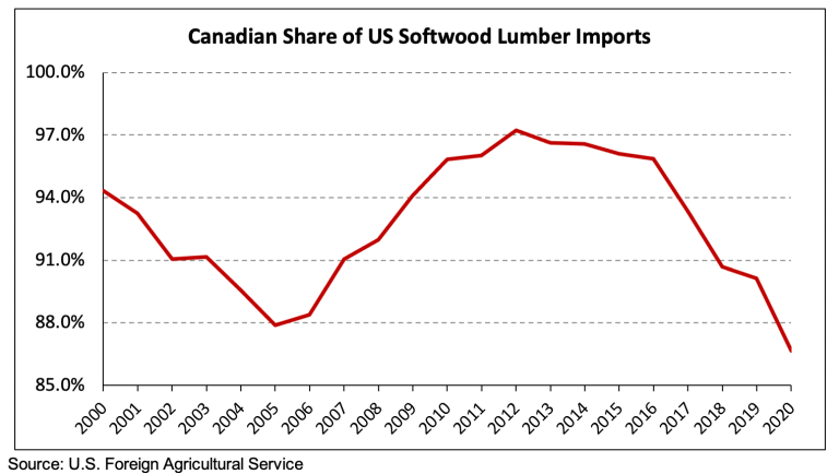 역사적으로 미국에서 가장 많이 침엽수 제재목을 수입하는 국가는 캐나다로써 2015년에는 약 96%이었지만 최근에는 점점 더 지분을 잃어가고 있습니다. 2012년에 최고 수준인 97.2%를 기록하였지만, 2019년에는 90.1%, 2020년에는 86.7%로 하락하였습니다.