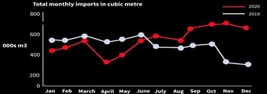 2020년 하반기에 영구이 수입한 침엽수량은 전년 대비 200,000m³상승하여 6.5 million m³이었고, 주로 스웨덴, 독일, 라트비아, 러시아에서 수입하였습니다. 2020년 상반기 즉 1사분기에서 2사분기까지 제재목과 판넬 수입량은 전년 대비 26% 하락하였습니다. 하지만 연말이 되어서는 하반기의 수입량이 증가하면서 전체적으로는 3% 증가하였습니다. 특히 4사분기에는 모든 생산품의 수입량이 전년 대비 거의 39% 상승하였습니다. 2020년 8월에서 12월까지 모든 제품의 수입량은 4.9 million m³이었고, 2006년 같은 시기가 2번째로 많은 양을 수입하여 4.8 million m³이었습니다.