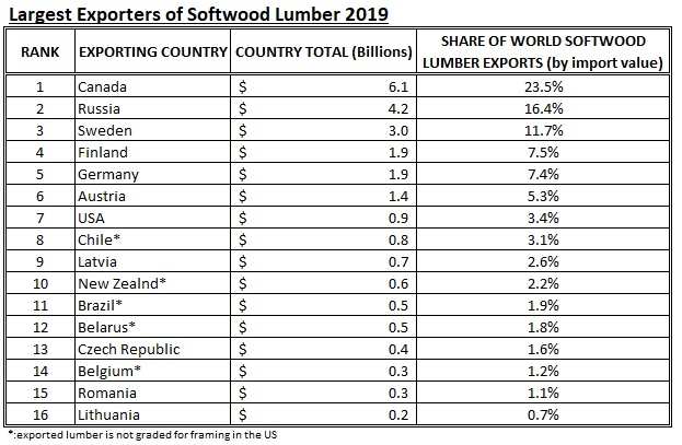 2019년에 83개국이 침엽수 제재목을 수출하였지만, 최상 15개 수출국 중에서 미국을 제외하고 11개국으로 이루어져 있습니다. 단지 5개국은 전세계 수출에서 1%대를 차지하고 있습니다.