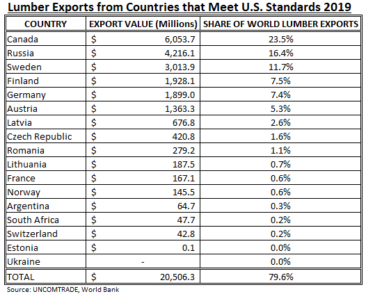2019년에 미국이 소비한 침엽수 제재목은 대략 47 billion board feet 이고, 이중에 30.8%는 48개국에서 수입되었습니다. 미국에서 주택용 제재목은 미국 제재목 기준 위원회 (American Lumber Standard Committee)에서 정한 엄중한 기준에 반드시 부합해야 하는데, 단지 16개국에서 생산된 제재목만 미국 구조용 등급에 부합하고 있습니다.