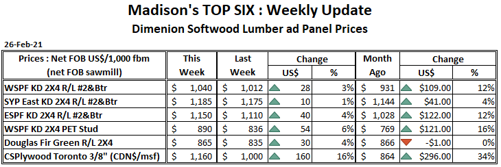 현재 전에는 한번도 본적이 없는 최고 수준에 이르면서, 2021년 2월 26일로 마감한 한주동안 침엽수 제재목 기준가격인 Western S-P-F KD 2×4 #2&Btr. 가격은 전주($1,012)대비 $28 혹은 3% 상승하여 US$1,040/mfbm 이었고, 전월 ($998)대비 $42, 4% 상승하였습니다. 그리고 전년(US$446/mbfm)대비 $594, 133% 높아졌습니다.