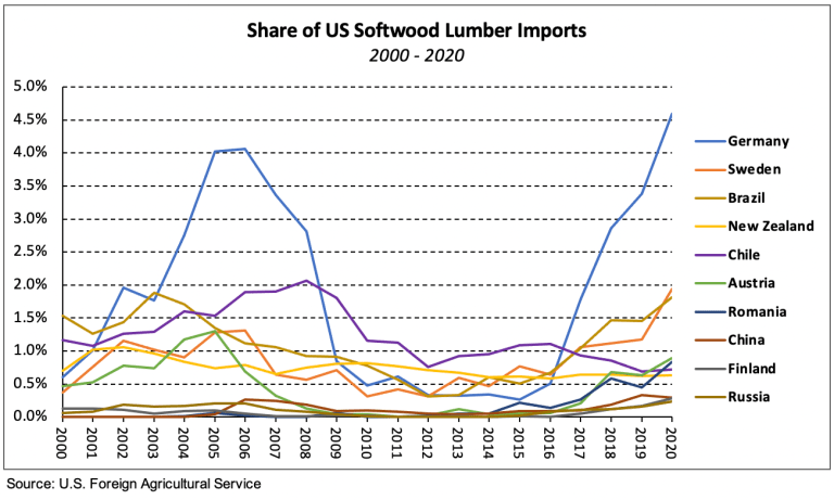 미국이 캐나다에서 수입되는 침엽수 제재목에 관세를 평균적으로 20% 부과하면서 급락하기 시작하였습니다. 2018년에 역사적인 가격 상승과 캐나다의 계획된 벌목 감소로 인하여 점점 감소했습니다. 캐나다에서의 수입이 감소해 나가면서, 다른 국가에서의 수입이 이 부분을 상쇄했습니다. 독일에서의 수입은 2016년이후 급격하게 증가하였는데, 0.6%에서 4.6%로 상승하였습니다. 스웨덴에서의 수입은 2013년이후 지속적으로 증가하여 0.3%에서 1.9%로 상승하였습니다.