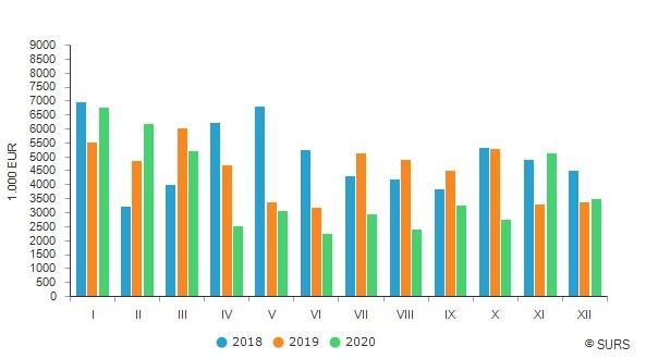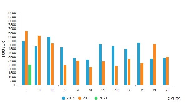 2021년 1월 슬로베니아 사유림에서 구입한 원목액은 2020년 12월과 비교하면 약 26% 하락하여 Euro 2.6 million이었고, 전년 대비 62% 감소하였다고 슬로베니아 통계청은 발표하였습니다. 전월대비 제재목용 원목과 veneer용 원목 구입액은 약 15% 감소하였고, pulpwood 구입액은 거의 50%, 목재 원료는 21%, 다른 산업용 원목은 약 15% 하락하였습니다. 2020년 1월과 비교하면 제재목용 원목과 veneer용 원목 구입액은 거의 64% 감소하였고, pulpwood 구입액은 거의 30%, 목재 원료는 80%, 다른 산업용 원목은 약 68% 하락하였습니다.