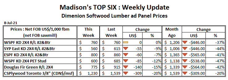 제재목 가격이 몇주간 큰 폭으로 하락한 이후에, 2021년 7월 8일로 마감한 한주 동안 구조용 침엽수 제재목의 기준 가격인 Western S-P-F KD 2×4 #2&Btr.의 도매 가격은 보합세를 유지하면서 US$760 mfbm이었습니다. 이 가격은 한달 전 ($1,206)과 비교하면 $446, 37% 하락하였지만, 일년 전 가격 (US$504 mfbm)가 비교하면 $256, 51% 높았습니다.