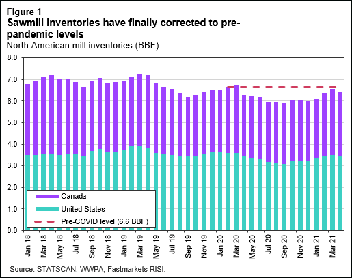 2020년 4월과 5월 발생한 최초 팬더믹 파동에서 빠르게 회복하면서 북미 생산이 표면적으로는 잘 진행되는 것 같았습니다. 하지만 실질적인 수요는 한해동안 총 61.6 BBF (2-3% 성장)이었고, 보고된 생산량보다 2 BBF 높았습니다. 이런 수요와 공급의 불일치가 유통 재고 부족을 일으켰고, 전례 없는 시장 변동성을 유발시켰습니다. 거의 한해 동안 지속된 공급망 붕괴후에 2021년에 공급 역학이 변화하기 시작하였습니다. 작년 엄청난 손상을 가한 산불 후 북서 태평양 지역에서 인양한 벌목을 통한 충분한 원목과 상대적으로 별일 없었던 봄계절의 시작이 병행되었고, 또한 1월에서 3월까지 노동력 상황이 빠르게 개선되면서 공장은 생산을 증대를 할 수 있었습니다. 미국 전역으로 백신이 접종이 시작되면서 Covid-19 확증율 급락도 이시기와 일치합니다.