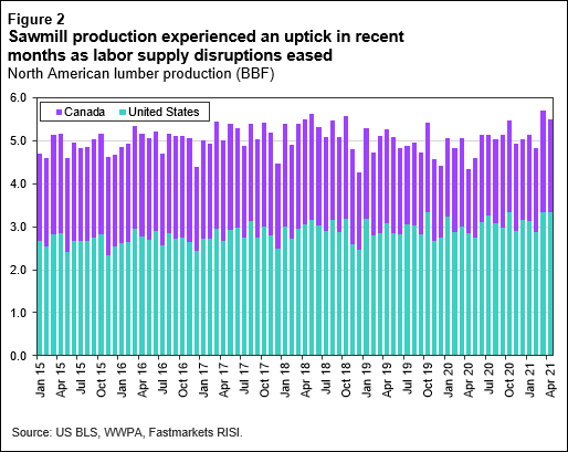 팬더믹과 관련된 노동력 부족은 제재 업체들의 생산량에 실질적으로 영향을 주면서 목재 관련 생산품들의 가격은 상승하였습니다. COVID-19 격리 지침을 준수하면서 생산과 운송에 많은 방해가 생겼고, 사업 운영이 어려워졌습니다. 시프트 추가와 초과 근무를 통한 대책이 불가능해지면서, 공장들은 2020년과 2021년 초반의 놀랍고 급격한 주택 수요에 대응하기 위한 생산 증대에 힘겨워하였습니다.