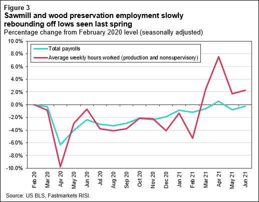 팬더믹 관련 붕괴들의 명확한 징조는 미국 노동통계국 (Bureau of Labor Statistics )의 자료에서 시작되었습니다. 제재와 방부 분야에서 고용의 경우, 긴 기간동안 전체 고용하락뿐만 아니라 공장에서의 평균 주당 작업 시간이 최근까지 Covid-19 이전 수준보다 2-5% 계속 낮았습니다. 제재소들의 고용 반등은 천천히 진행되었고, 생산 작업 시간과 비상근 직원 고용을 통하여 겨울 동안 생산 속도를 회복하기 위하여 분투하였습니다. 공장들은 초과 근무를 부과하지 못하였고, 보통 시간 수준으로 작업하려고 노력하였습니다. 팬더믹이 걷잡을 수 없이 치솟으면서 더 많은 노동자들이 격리되었기 때문에, 급여 대상자에 더 많은 사람들이 있다는 것이 더 많은 작업, 일을 했다고 혹은 생산량이 증가하였다고 해석하기 힘듭니다. 팬더믹 비율과 제재소 생산 비율은 직접적으로 연결되어 있습니다. 2021년 1월 팬더믹 비율이 최고에서 하락하기 시작하면서 제재소에서 작업하는 시간이 실질적으로 급증하였습니다. 생산을 위한 주당 평균 작업 시간과 비상근 고용이 회복되면서, 2021년 4월에는 8% 상승하였고, 6월에는 그 이상의 수준을 보여주었습니다. 그러는 동안 제재목 가격이 하락하면서 초과 근무 증대 필요성은 진정되는 것으로 보입니다. 제재목 생산과 운송 자료들은 증가된 작업 시간에 일치하는 경향을 보여주고 있고, 시장이 절실하게 원하고 있는 시장 균형을 충족시킬 수 있는 용량을 보여주기 시작하였습니다.