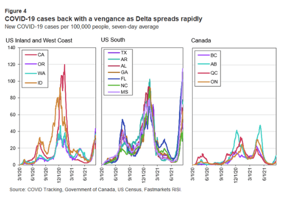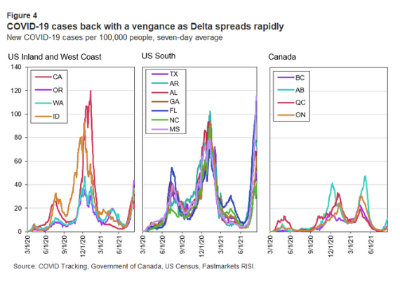 만약에 Covid-19건수 하락이 공급 붕괴를 경감시키는 것을 의미한다면, Delta 변이 상승이 또 목재 관련 생산품 공급 붕괴를 의미하는 것인가 하는 의문이 생깁니다. 미국 일부 주 특히 미국 남부 지역에서 바이러스 감염 사례들이 빠른 속도로 상승하고 있습니다. Delta 변이 여러 지역을 빠르게 강타하고 있지만, 입원 혹은 사망률 속도는 그렇게 빠르지 않다는 것에 모두가 다행으로 생각하고 있습니다. Covid 양성 노동자들은 집에서 격리하는 것을 의무화하였기 때문에, 제조와 유통 붕괴를 측정하는 주요 기준으로 Delta 변이는 실제 사례 수준을 유지하고 있습니다. 미국 남부 지역에 Delta 변이 파동이 심해지면서, Southern Yellow Pine (25 BBF) 공급 속도가 떨어질 것으로 예상하고 있습니다. 하지만 SYP의 경우 방부 시장의 부진으로 현재 공급 초과인 상황입니다. 이런 상황때문에 미국 남부 지역의 생산 붕괴를 예상할 수 있지만, 북미의 나머지 지역에서의 생산은 지난 겨울 바이러스가 창궐할 때에 비하면 좀 더 관리가 가능할 것으로 보입니다. 주된 이유는 태평양 북서부 지역과 캐나다에서 백신 접종이 미국 남부 지역보다 월등히 높기 때문입니다. 백신 접종을 받은 사람들 사이에서 돌파 감염 수가 증가하고 있지만, 바이러스 전파와 대항하는데 백신이 가장 효율적인 적인 것 같습니다. 미국 남부 지역을 제외한 미국 전체 생산의 2/3를 책임지는 다른 지역에서의 Delta 변이 감염건수는 작년 가을과 겨울의 최고치보다 아주 낮은 수준이어서, 제재목 공급은 좀 더 유연하게 대처할 수 있을 것이라고 예상합니다.