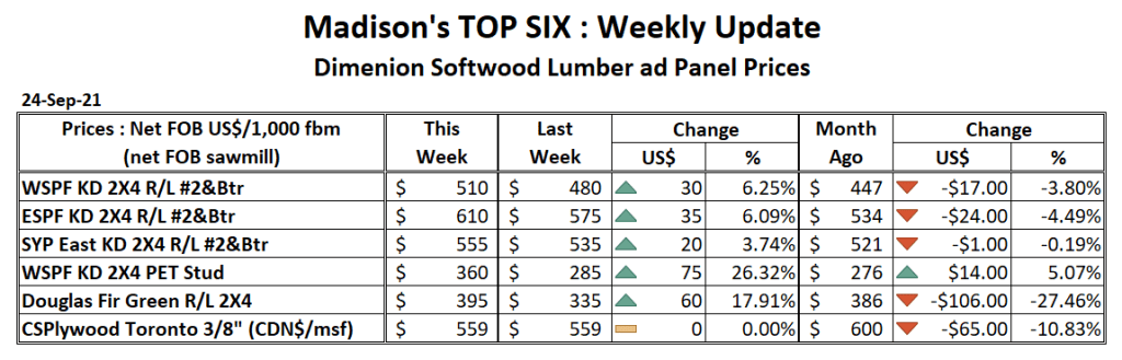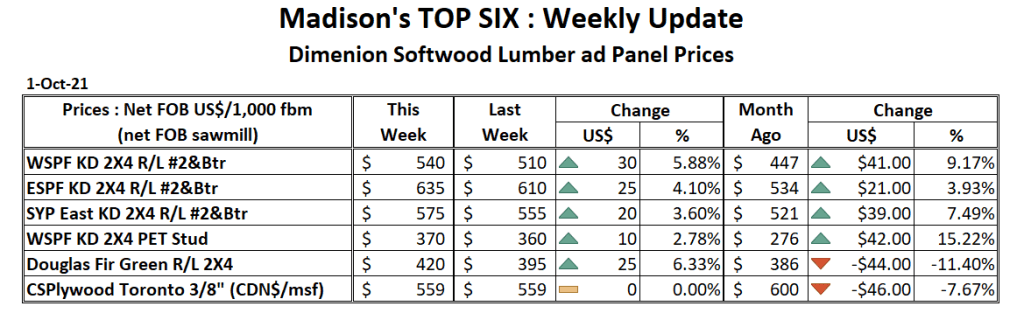 미국의 노동절 휴일 이후에 가격이 꾸준히 상승하면서 2021년 9월 30일로 마감한 주의 Western S-P-F 2×4 #2&Btr KD (RL)의 가격은 $540 mfbm으로 지난주 가격인 $510보다 $30, 6% 상승하였습니다. 그리고 작년 같은 시기의 가격인 $960과 비교하면 $420, 44% 낮지만, 2년전 가격인 $376보다는 $164, 44% 높습니다.