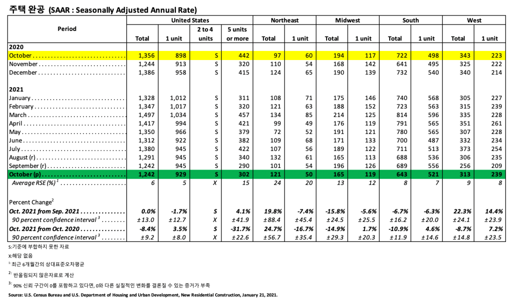 2021년 10월 사유 주택 완공은 1,242,000 (SAAR)으로 2021년 9월 (1,242,000)과 비교하면 변화가 없었고(±13.0%), 2020년 10월 (1,356,000) 보다 8.4% (±9.2%) 하락하였습니다. 2021년 10월 단독 주택 완공은 929,000 (SAAR) 으로 2021년 9월 (945,000)에 비하여 1.7% (±12.7%) 하락하였습니다. 1월의 5가구 이상의 다중 주택 완공은 302,000 (SAAR) 이었습니다.