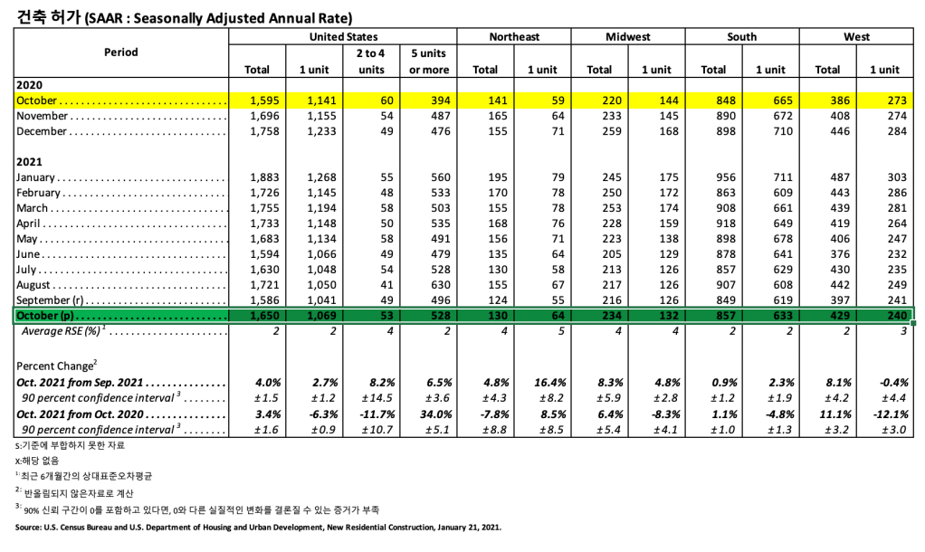 2021년 10월 사유 주택 건축 허가는 1,650,000 (SAAR : Seasonally Adjusted Annual Rate) 으로 2021년 9월 (1,586,000) 보다 4.0% (±1.5%) 상승하였고, 2020년 10월 (1,595,000)과 비교하여 3.4% (±1.6%) 상승하였습니다. 2021년 10월 단독 주택 건축 허가는 1,069,000 (SAAR)로 2021년 9월 (1,041,000)과 비교하여 2.7% (±1.2%) 상승하였습니다. 5가구 이상의 다중 건물의 10월 허가는 528,000 (SAAR) 이었습니다.