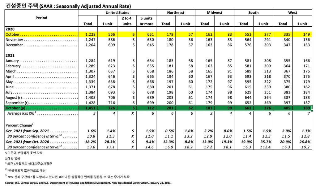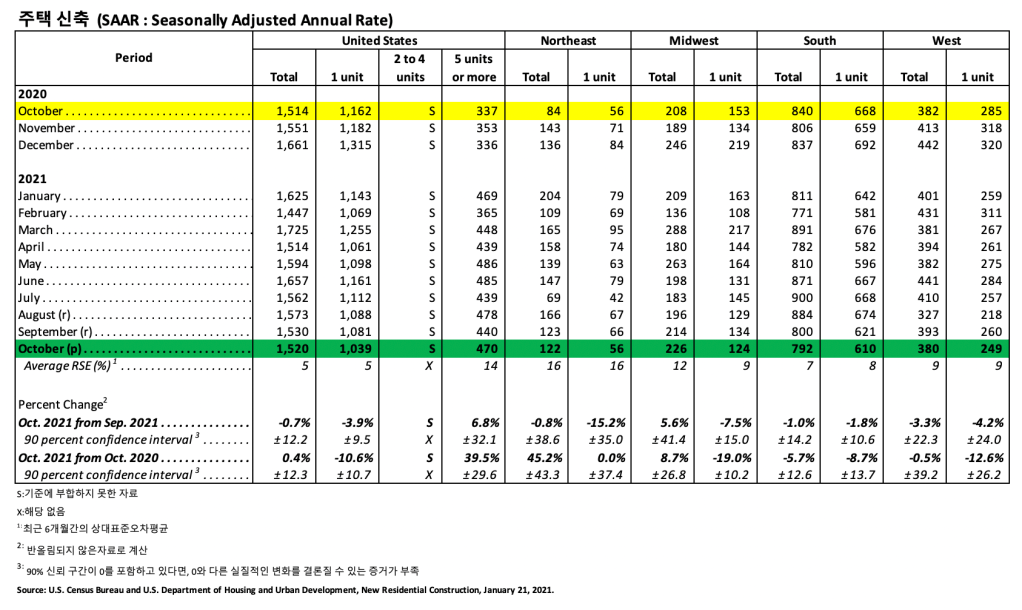 2021년 10월 사유 주택 신축은 1,520,000 (SAAR)으로, 2021년 9월 (1,5300,000) 보다 0.7% (±12.2 %) 낮았지만, 2020년 10월 (1,514,000) 보다는 0.4% (±12.3%) 높았습니다. 10월의 단독 주택 신축은 1,039,000 (SAAR)으로 9월 (1,081,000)과 비교하여 3.9% (±9.5%) 하락하였습니다. 5가구 이상의 다중 주택 10월 신축은 470,000 (SAAR) 이었습니다.