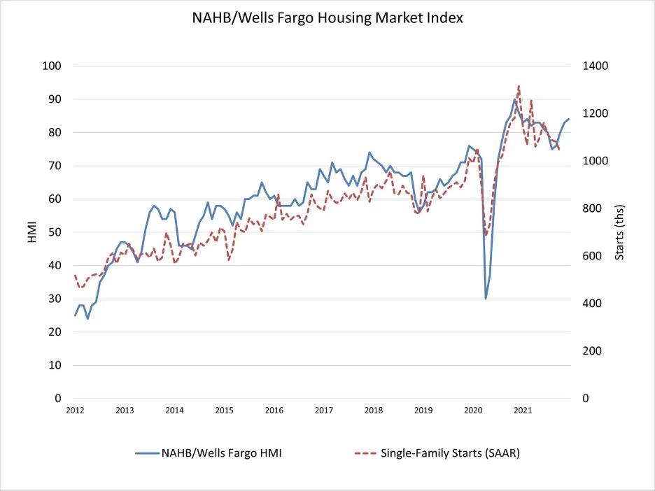 인플레이션 염려와 진행되고 있는 생산 병목 현상에도 불구하고, 4달 연속으로 소비자 수요가 강세이고 기존 재고가 제한되면서 주택 건설 신뢰 지수는 좀 더 상승하였습니다. 새로 건설되는 단독 주택에 대한 시장의 건설 정서는 12월에 84로 1 포인트 상승하였다고 National Association of Home Builders (NAHB)/Wells Fargo Housing Market Index (HMI)는 발표하였습니다. 이 수치는 지난 2월에 기록한 가장 높은 치수와 일치 합니다.