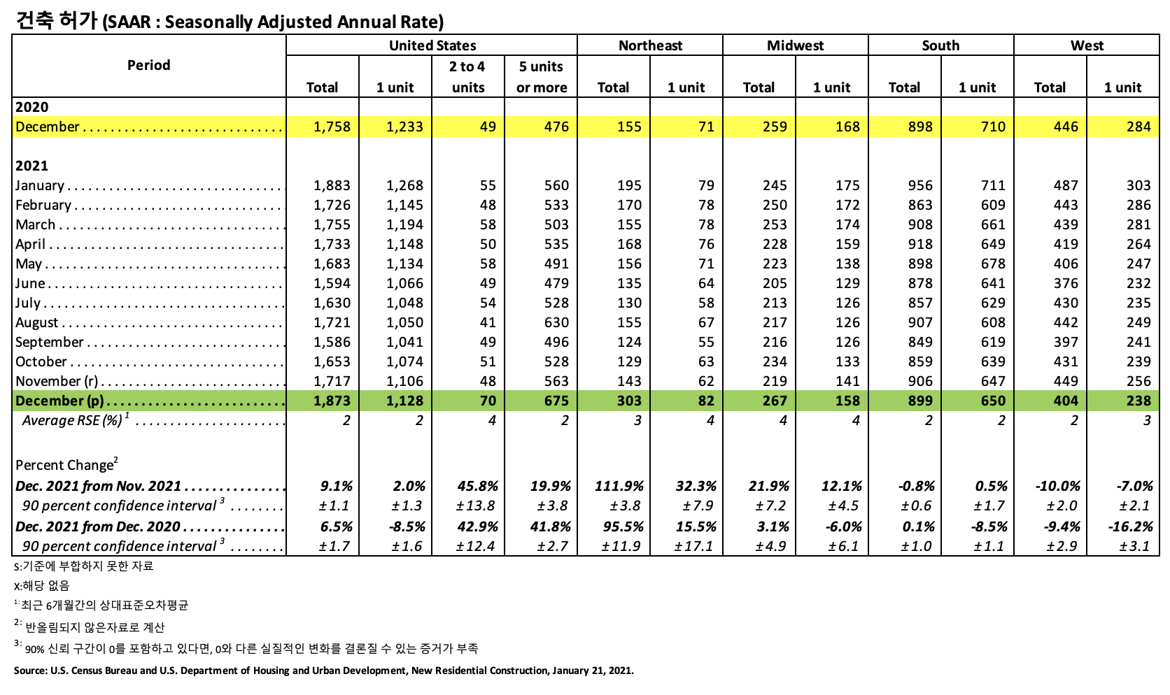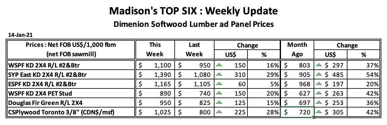 2022년 1월 14일로 마감한 주의 제재목 기준 가격인 Western S-P-F 2×4 #2&Btr KD (RL)의 가격은 지난주 가격 ($1,100) 보다 $70, 6% 상승하여 US$1,170 mfbm이었습니다. 지난 달 가격인 $803와 비교하면 $367, 46%, 지난해 같은 시기의 가격인 $944와 비교하면 $220, 24% 높았습니다. 2년전 가격인 $402보다도 $768, 191% 높았습니다.