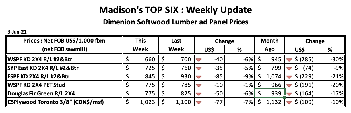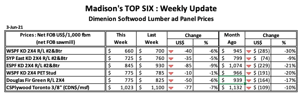 일반적으로 이맘때는 대형 주택 시공 업체들과 건설 회사들이 자신들의 프로젝트를 위한 목재를 받으면서 제재목 가격은 하락하기 시작합니다. 하지만 2021년 같은 주에 제재목 가격이 상상도 하지 못할 수준으로 상승하면서 2-3주를 유지하다가 하락하였습니다. 최근 교통 문제는 어느 정도 완화되면서, 배달 지연은 한달에서 2주정도로 감소하였습니다. 오퍼에 대한 발주가 제한되면서 판매자들 간에 강력한 경쟁이 생기면서 공급은 개선되었습니다. 제재소들의 오퍼 가격 계속해서 하락하고 있지만, 이번 주 가격 하락은 전주 하락에 비하여는 심하지 않았습니다.