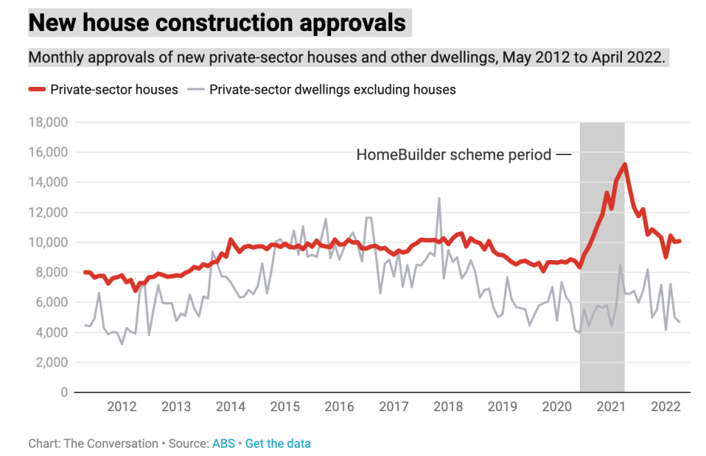 만약에 누가 위기가 시작된 구체적인 날짜를 선택하면, 2020년 6월 3일 일 것 입니다. 이 날 호주 Morrison 정부는 주택 시공업체를 위한 자금 계획 A$688 million를 발표하였습니다. 그리고 주 정부들도 연속해서 건설 보조금을 제공하였습니다. 보조의 이유는 팬더믹이 주책 건설을 완전히 파괴할 것이라는 공포 때문 이었습니다. 2019년 Master Builders Association는 2020년과 2021년에 주거 건물 신축이 3.5% 하락할 것이라고 예측하였습니다. in 2019 had forecast new-dwelling starts would decline 3.5% in 2020/21. COVID 공포 소용돌이의 초기 단계중인 2020년 4월에 신축은 급격하게 40% 하락하였습니다. 2020년에서 2021년 주거 건물 신축 허가는 25% 이상 증가하였습니다. 그리고 주택 허가는 40% 이상 증가하였습니다. 명백하게 다수의 요인들이 이런 증가를 이끌었습니다. 호주 연방 준비 은행은 3월에 이자율을 0.75%에서 0.25%로 하락 시켰고, 11월에는 0.1%로 낮추었습니다. 많은 자본을 다양한 방법으로 경제에 쏟아 부었습니다.