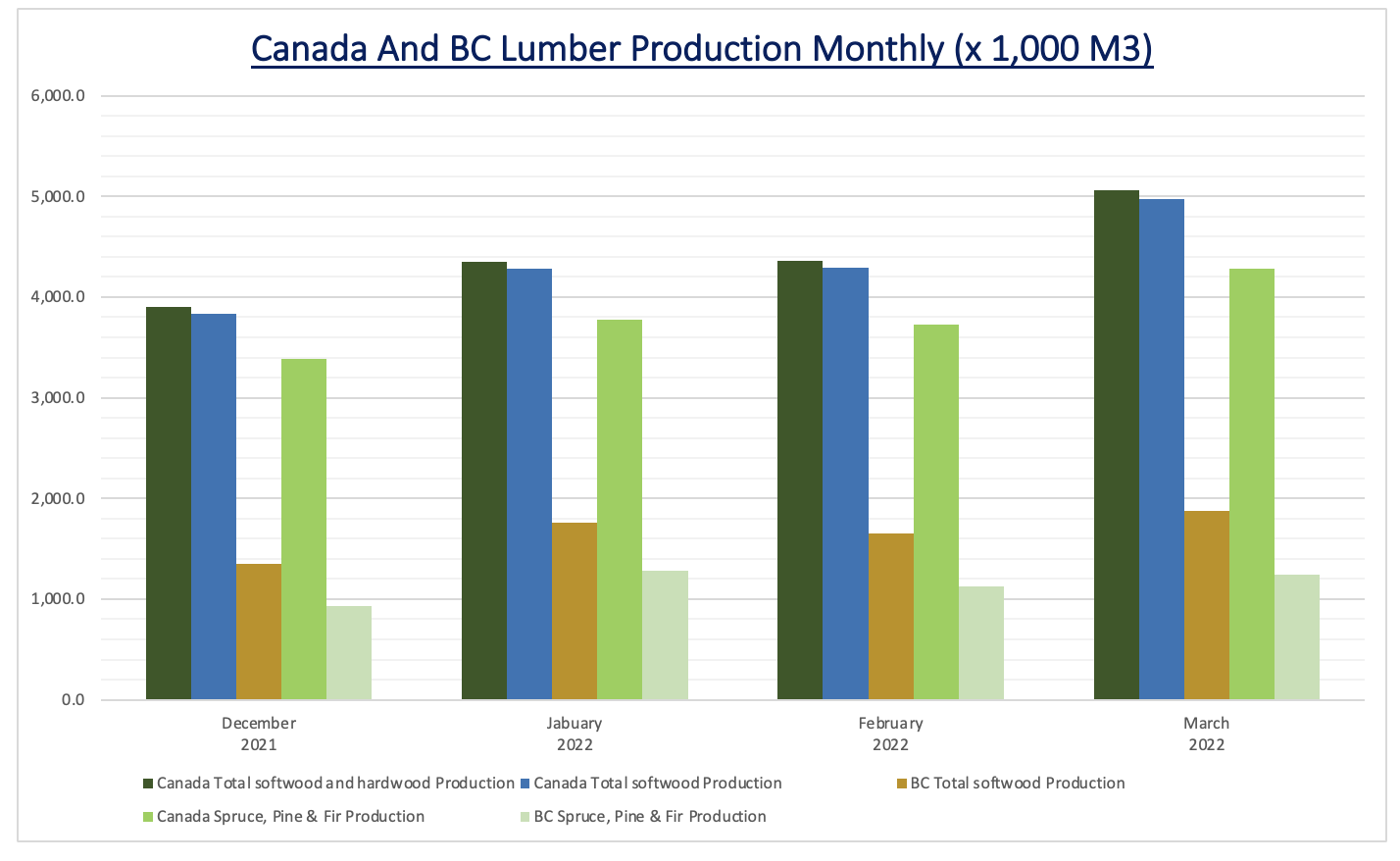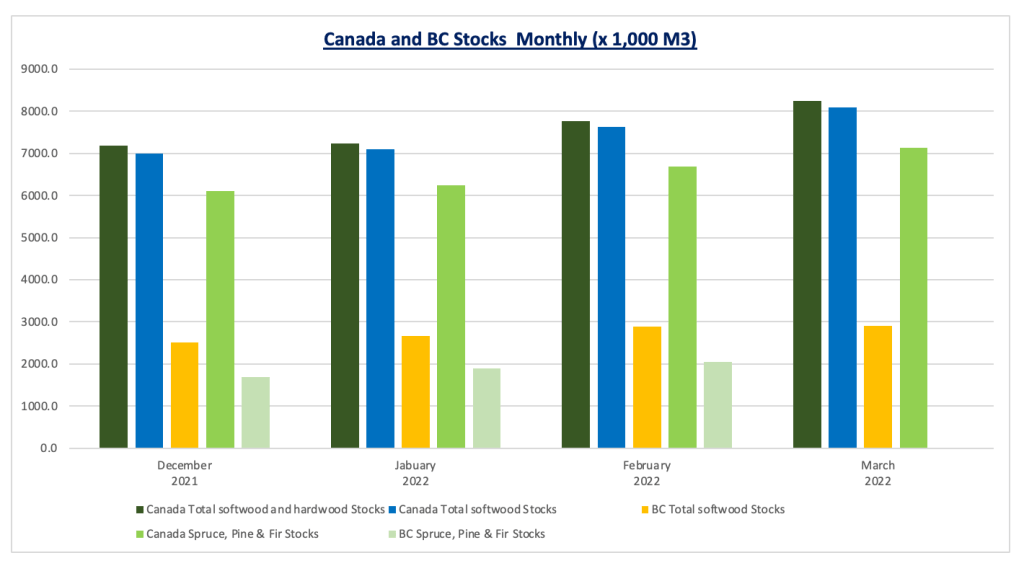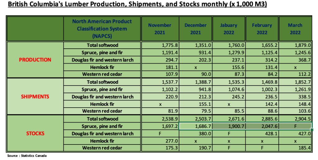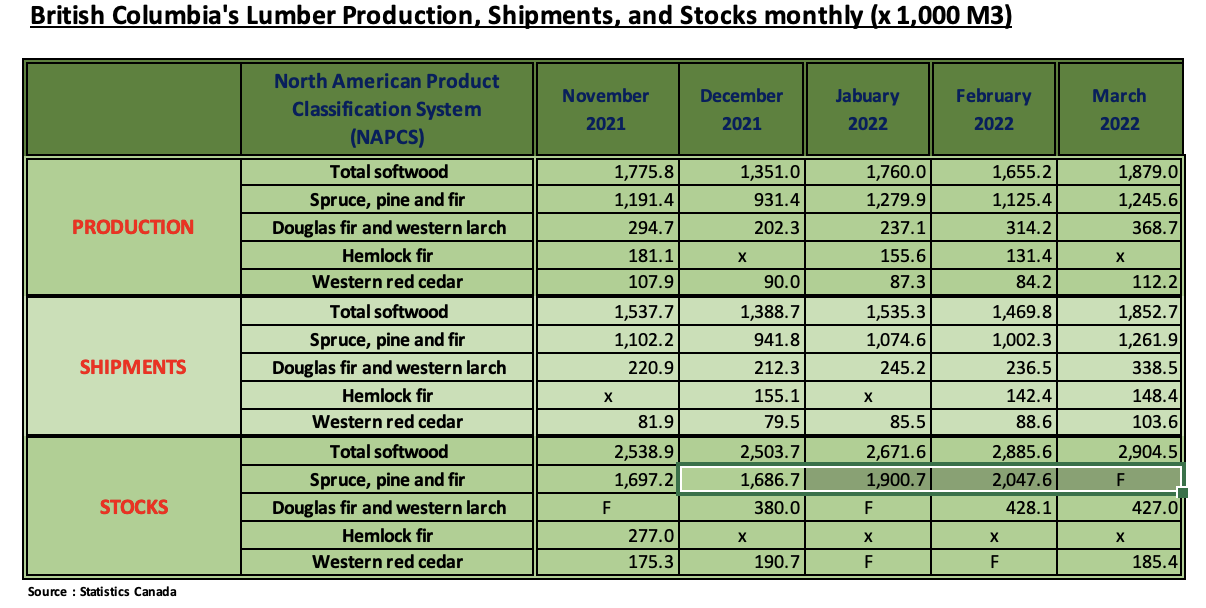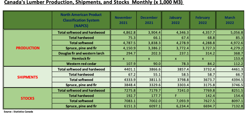 2022년 3월 캐나다 제재목 생산량, 운송량, 재고량 상황