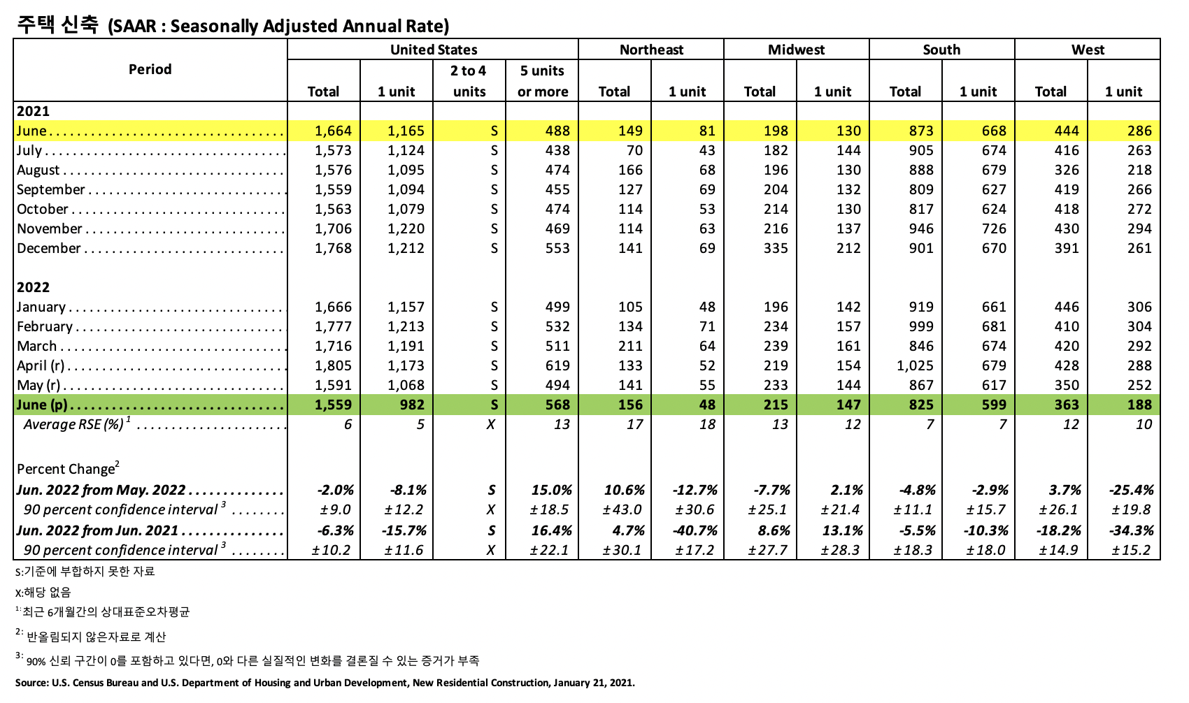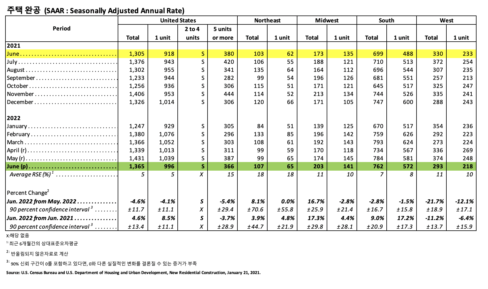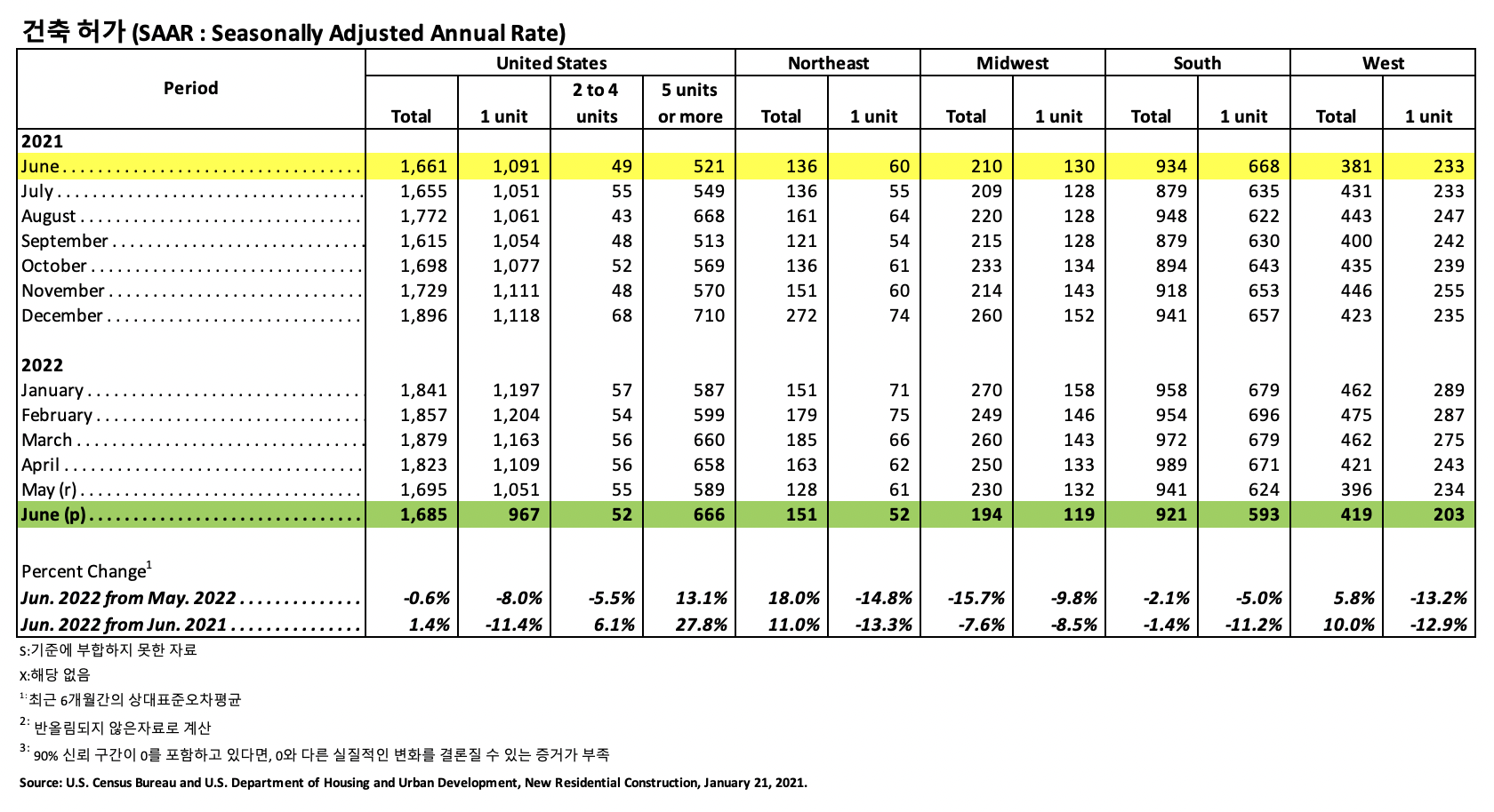 판매 조정 재고 수준은 6월에 9.3개월 공급으로 상승하였습니다. 완공되어 바로 입주 가능한 새로운 주택은 전국적으로 39,000 입니다. 아직 건축되지 않은 주택 판매량은 상승하여 전년 대비 25.1% 높았습니다. 판매 중간 값은 6월에 $402,400으로 5월보다 9.5% 하락하였지만, 전년 대비 7.4% 상승하였습니다. 올해 초부터 현재까지 2022년 상반기 전국적인 주택 판매량은 13.45 하락하였습니다. 지역적으로 동북부는 12.1%, 중서부는 24.8%, 남부는 12.6%, 서부는 9.6% 하락하였습니다.
