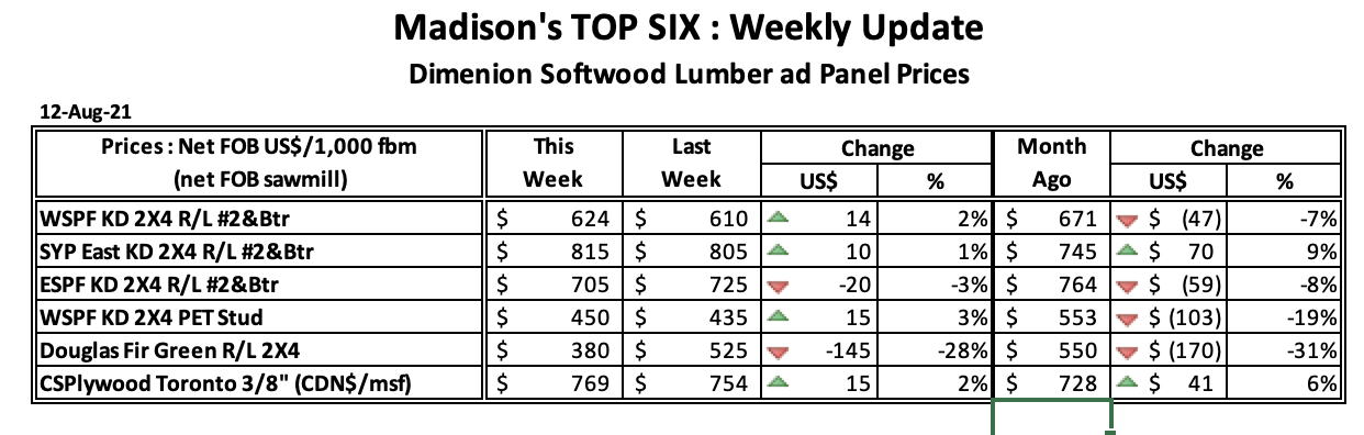 제재목 시장과 현재 가격에 관하여 말하자면, 6월 중순에 상당한 가격 하락이 침엽수 제재목의 새로운 수요를 창출하는데 성공적이었습니다. 그러면서 가격이 이전 주의 가격 수준으로 거의 상승 하였습니다. 하지만 판매량은 여전히 적절하지 않았고, 구매에 대해 보수적인 구매자들에게 어느 정도 동기를 부여하는 계절적 감산이 어렴풋이 나타나기 시작하였습니다. 그런 판매 증가는 생산업체들이 가격을 상승시키기에 충분하였습니다. 이중의 Canada Day와 미국 독립 기념일의 장기 휴일 기간은 침엽수 제재목 판매 부진과 연간 최저 가격으로 접근하는 때 입니다. 주택 신축 그리고 폭풍, 홍수, 산불과 같은 기후 위기 상황과 같은 거시 경제의 다수 조건에 의하여 결정되는 일반적인 계절적 가격 사이클이 올해도 발생했는지의 여부가 아직 정확하게 알려지지는 않습니다. 6월 24일 마감한 주의 제재목 가격은 이전 주의 큰 하락에서 반등하여, 침엽수 제재목 기준 가격인 Western Spruce-Pine-Fir 2×4 #2&Btr KD (RL)의 가격은 $630 mfbm이었습니다. 이는 전주 가격인 $535보다 $95, 18% 상승하였고, 전월 ($945) 대비 $315, 33% 하락하였습니다. 작년 같은 시기의 가격인 $900 mfbm와 비교하면 $270, 30% 낮았지만, 2년전 가격인 $436 가격보다는 $194, 44% 높았습니다.