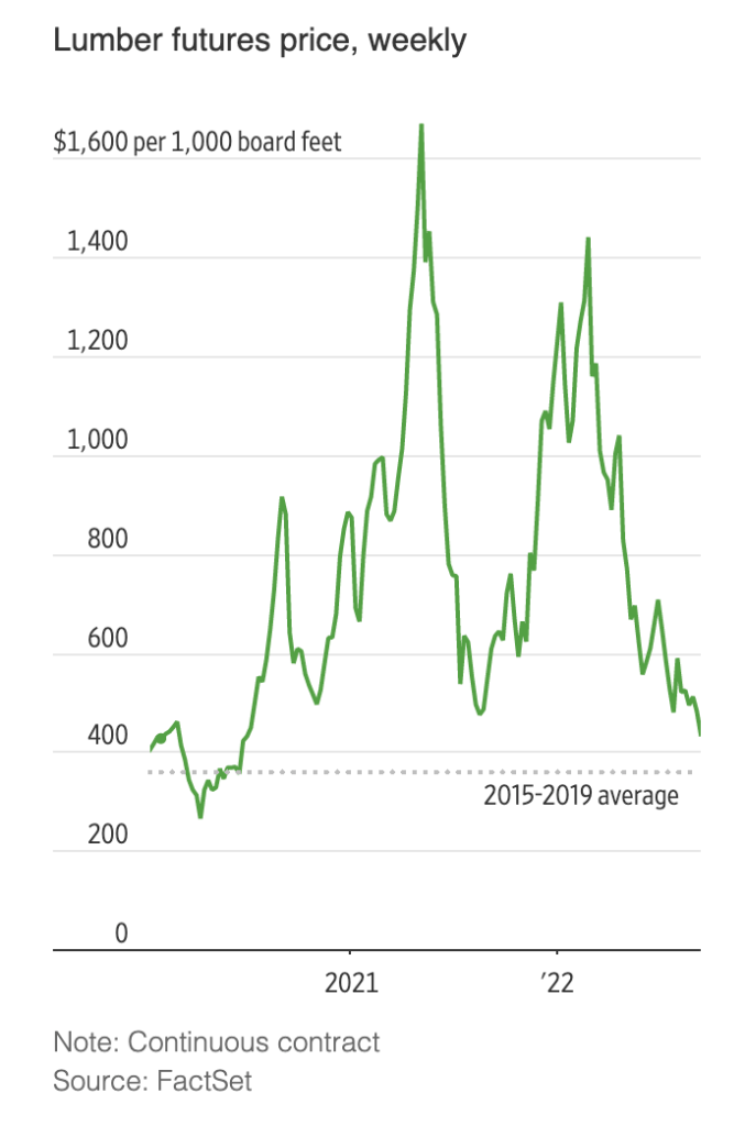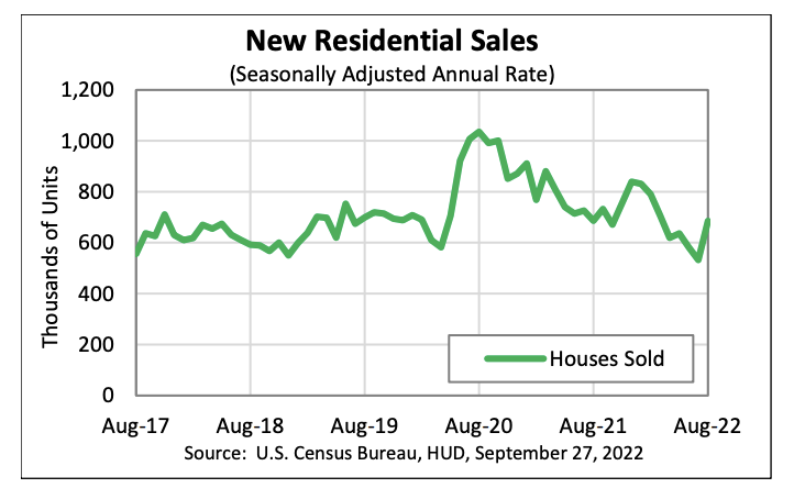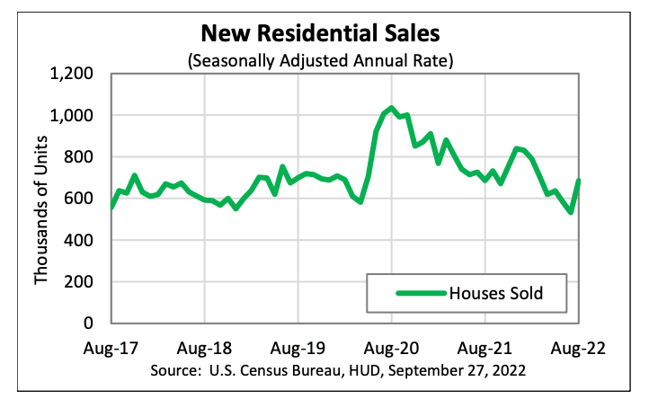 목재를 사용하는 시장과 건축에서 가장 큰 지분을 가지고 있는 단독 주택의 6월 신축은 최근의 하락에서 회복되어 3.4% 상승하여 935,000 units이었습니다. 2022년 8월 단독 주택 허가는 899,000 units으로 7월의 932,000 units보다 3.5% 하락하였습니다. 건축 허가는 일반적으로 시공 2개월전에 제출되어서, 2개월 후의 건축 활동에 대한 지표입니다. 기민한 투자자들은 건설용 침엽수 제재목 가격이 미국 주택 건설과 주택 판매의 좋은 지표로 생각하고 있습니다. 제재목 가격을 살펴보면 2022년 9월 23일로 마감한 주의 침엽수 제재목 기준 가격인 Western S-P-F 2×4 #2&Btr KD (RL) 가격은 US$520 mfbm으로 전주와 같은 수준이었고, 한달전의 가격인 $603보다는 $83, 14% 하락하였습니다. 미국 주택 가격 자료를 얻기에 앞서 침엽수 제재목 가격으로 접근할 수 있습니다. 미국 통계청 (U.S. Census Bureau)과 미국 주택 도시 개발부 (US Department of Housing and Urban Development)는 새집 판매와 주택 가격 자료를 9월 27일에 발표하였습니다. 새 단독주택 판매는 전체 부동산 활동의 10%를 차지하고, 주택 시장의 선두 지표 입니다. 최근과는 눈에 띄는 반전을 보여 주면서 8월의 미국 새 단독 주택 판매는 급격하게 증가하였습니다. 8월의 새 단독 주택 판매는 7월의 532,000와 비교하여 28.8% 증가하여 685,000 이었습니다. 그리고 9월의 새 단독 주택 판매 8월과 거의 같은 수준으로 686,000이었습니다.