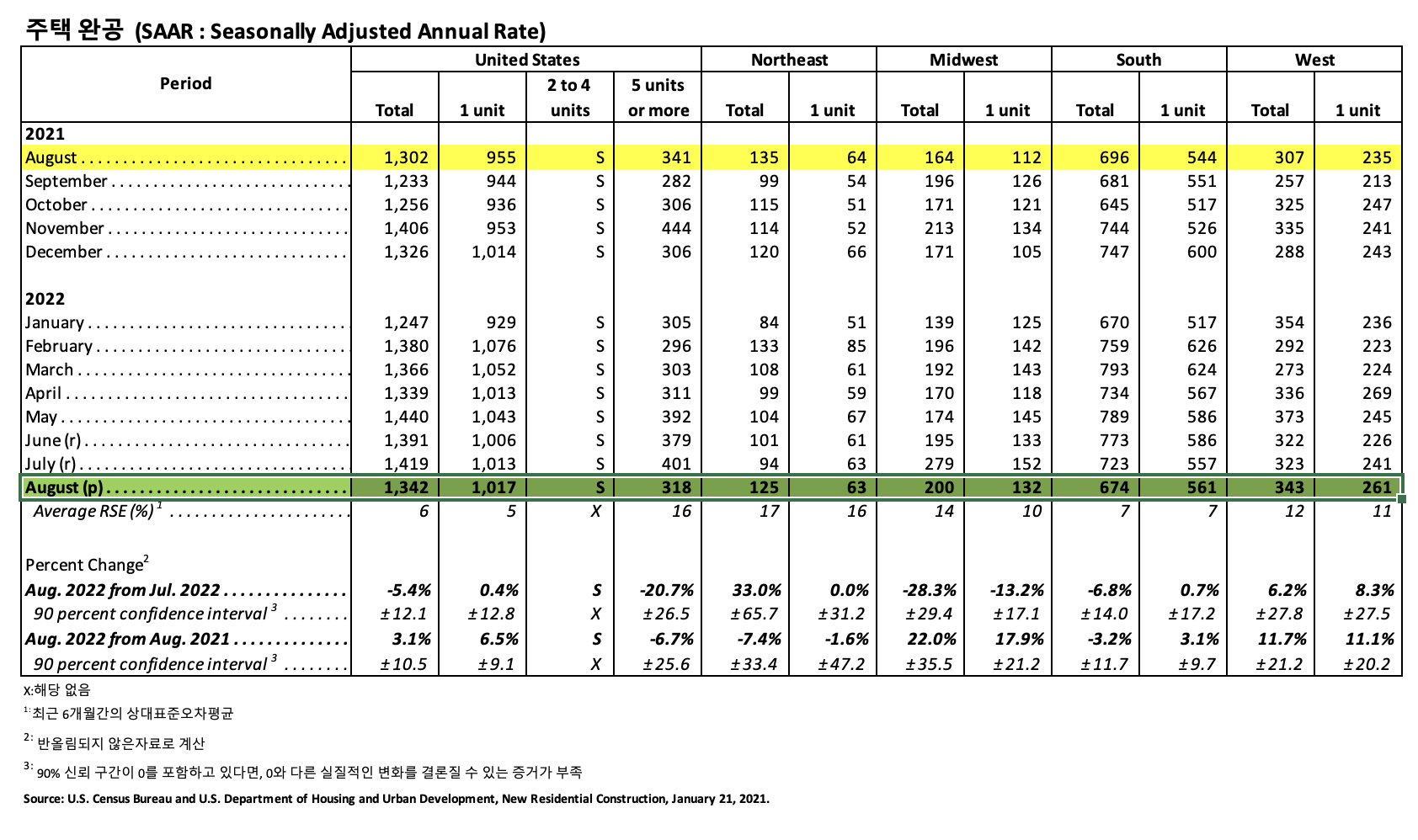 주택 완공 (Housing Completions) 2022년 8월 사유 주택 완공은 1,342,000 (SAAR)으로 2022년 7월 (1,419,000)과 비교하면 5.4%(±12.1%) 하락하였고, 2021년 8월 (1,302,000) 보다 3.1% (±10.5%) 상승하였습니다. 2022년 8월 단독 주택 완공은 1,017,000 (SAAR) 으로 2022년 7월 (1,013,000)에 비하여 0.4% (±12.8%) 상승하였습니다. 8월의 5가구 이상의 다중 주택 완공은 318,000 (SAAR) 이었습니다.